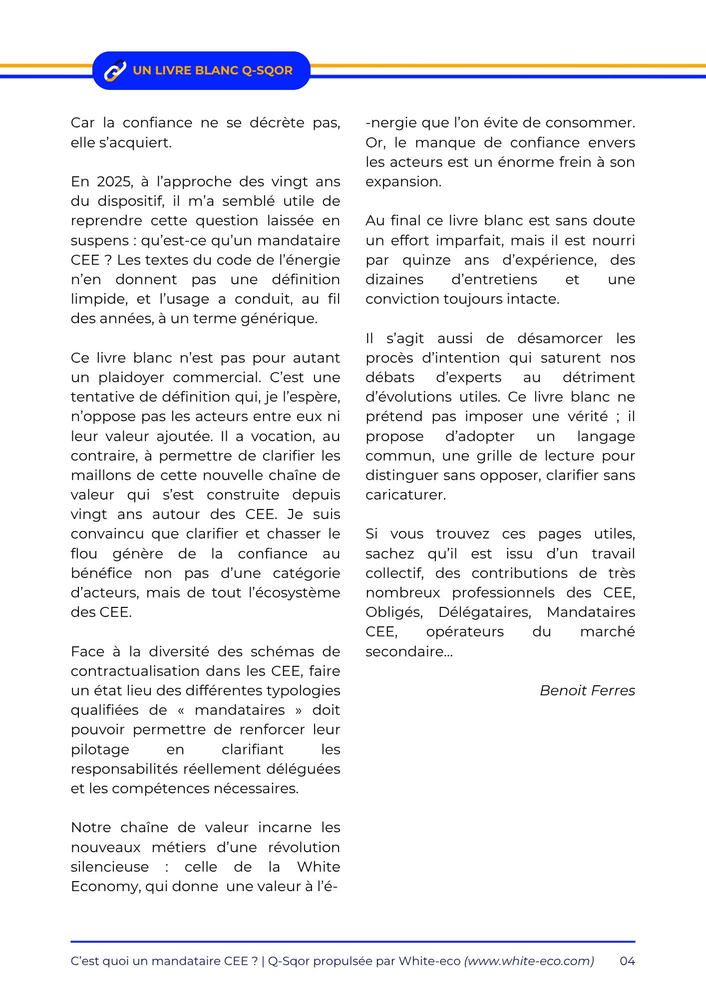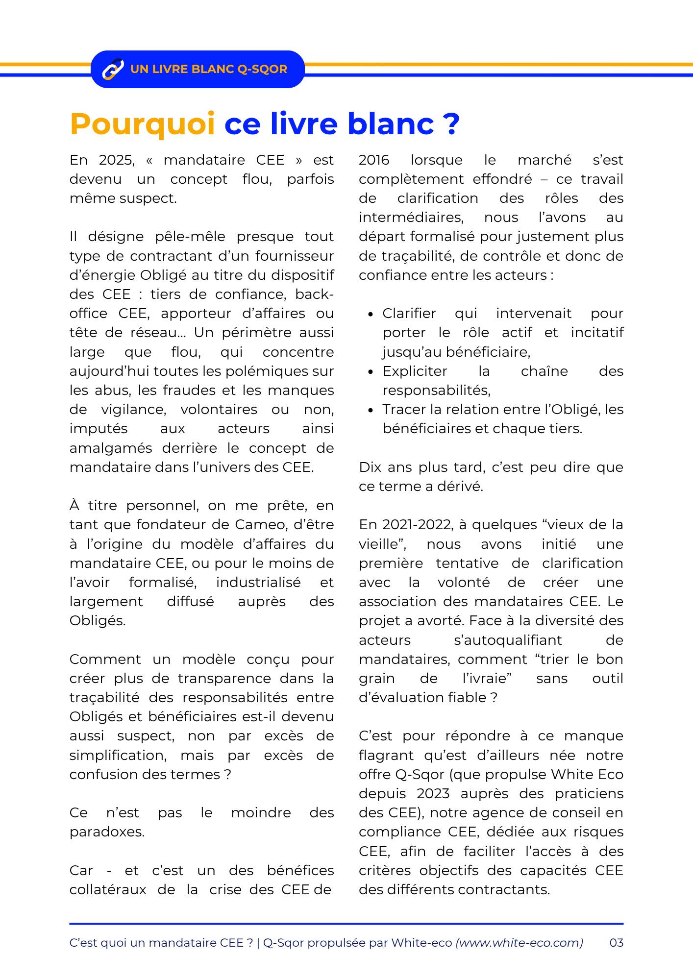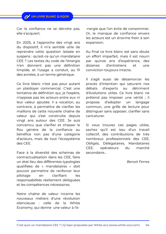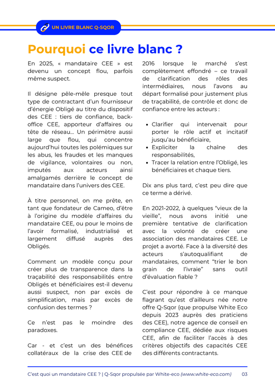 Ce livre blanc synthétise une série d’échanges réalisés avec des acteurs clés du dispositif CEE. Il clarifie la position du mandataire dans la chaîne de valeur, met en lumière les enjeux de responsabilité, et propose une lecture partagée des interactions entre opérateurs, mandataires, délégataires et Obligés.